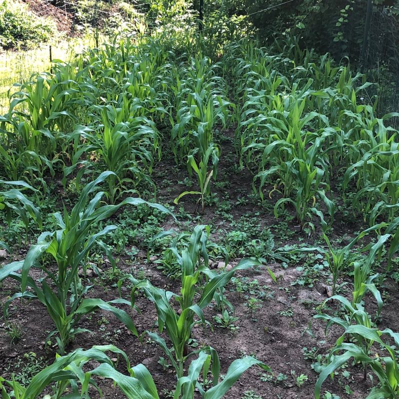 - 4 8’ rows of bantam organic corn (planted 1mo after the hybrid)
